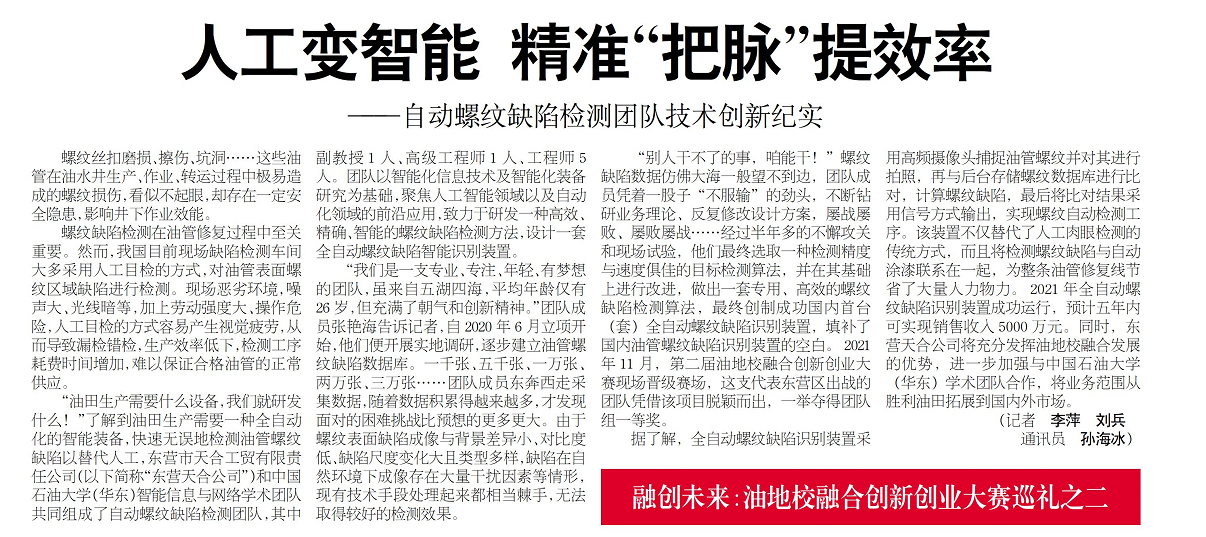 奮進新征程 建功新時代|人工變智能 精準“把脈”提效率——自動螺紋缺陷檢測團隊技術創(chuàng)新紀實 (東營日報專訪)